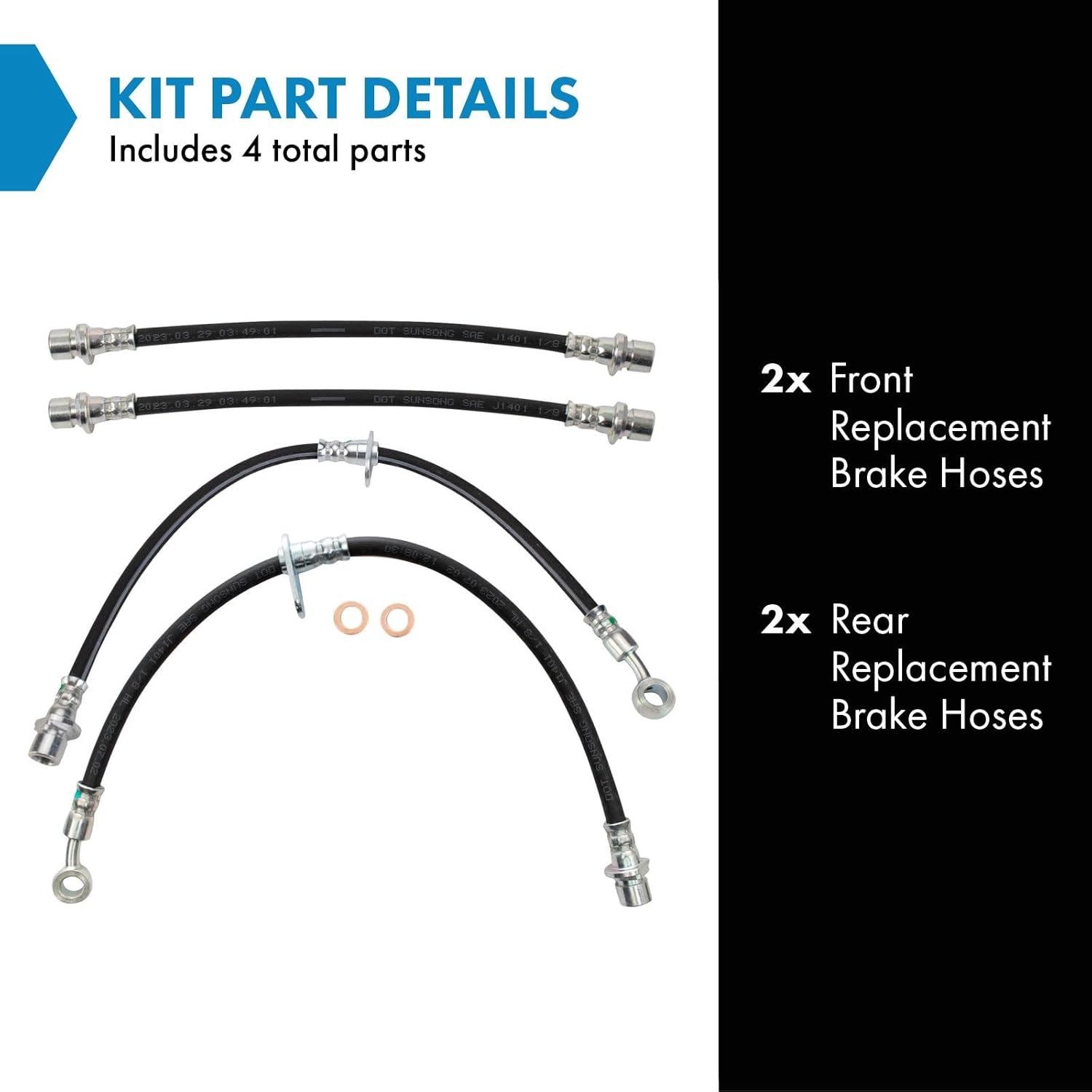 4 Piece Brake Hose SetKit Includes(2) Front Replacement Brake Hoses(2) Rear Replacement Brake HosesFitmentHonda Accord 2003-07 - Front & Rear with Rear Disc BrakesProduct AttributesQuantity: 4 PieceProduct Features Safety assured: Certified by DOT Upgraded durability: Multi-layer EPDM hose Engineered to meet or exceed OEM standards Precision designed for a perfect fitReference Numbers01464SDAA0101464SDAA0301464SEPA0001465SDAA0101465SDAA0301465SDAH0001465SEPA0001466SDAA5001466SDAH0001468SDAA5001468SDAH00073-1832073-1833073-1843073-1844150.40092150.40093150.40356150.4035718J195518J195618J195718J1958350-59065350-59066350-59158350-5915946431SDAA5178936789377893878939BH140289BH140290BH140340BH140341BH142817BH142818BH381544BH381545BH381546BH381547H620402H620403H620414H620415