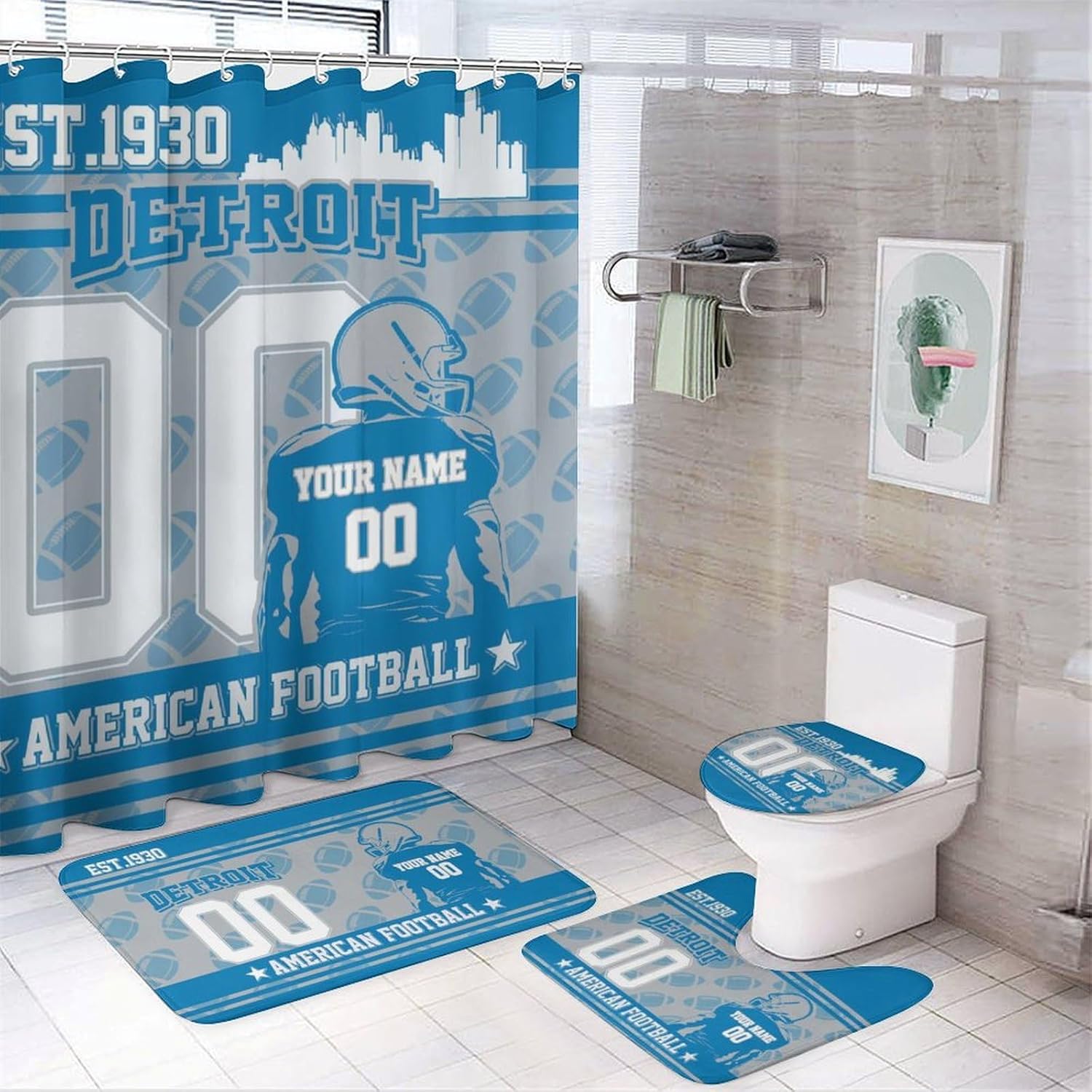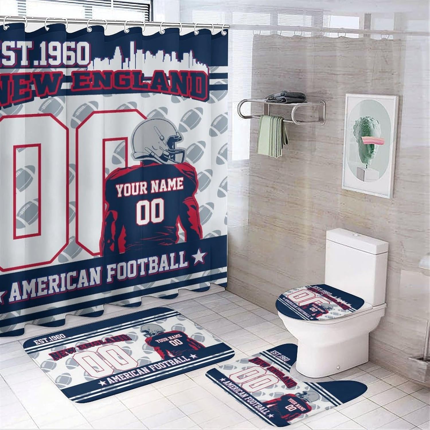 Product Set: Including Shower Curtain, Floor Mat, Toilet Cover Mat And U Floor MatProduct Description: Bring a passion for sports into your everyday life! This American Football Style Shower Curtain 4-Piece Set is made for you who love sports and personalized design, perfectly combining functionality with unique aesthetics. Each set of shower curtains is customized with a name and number to suit your needs, turning your bathroom into your very own stadium and showcasing your individual style. Whether you're a big fan of American football or a friend looking for a special gift, this shower curtain set makes a unique gift for life! Comprehensively meet your bathroom decoration needs. The shower curtain type is made of high quality waterproof fabric with good waterproof performance, which is especially suitable for bathrooms in humid environments. Avoid splashing water to affect the bathroom dry and tidy, keep hygiene. Provide a comfortable bathing experience for your family. This Personalized American Football Shower Curtain 4 Piece Set is not only ideal for home décor, but also makes a special gift for a close friend, family member, or yourself if you love sports. Easy to install and with the perfect set design, it will instantly energize your bathroom with sports and make it a unique and charming space in your home. Give you a unique experience by customizing your exclusive name and number now.