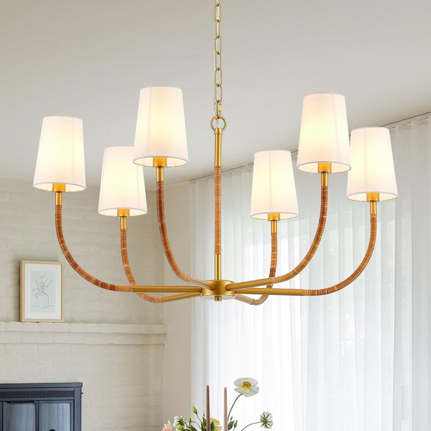 WHY CHOOSE US?This modern gold chandelier seamlessly combines contemporary style with rustic farmhouse appeal. Its metal and fabric construction creates a warm, inviting glow, making it a versatile centerpiece that complements a wide range of home decors.